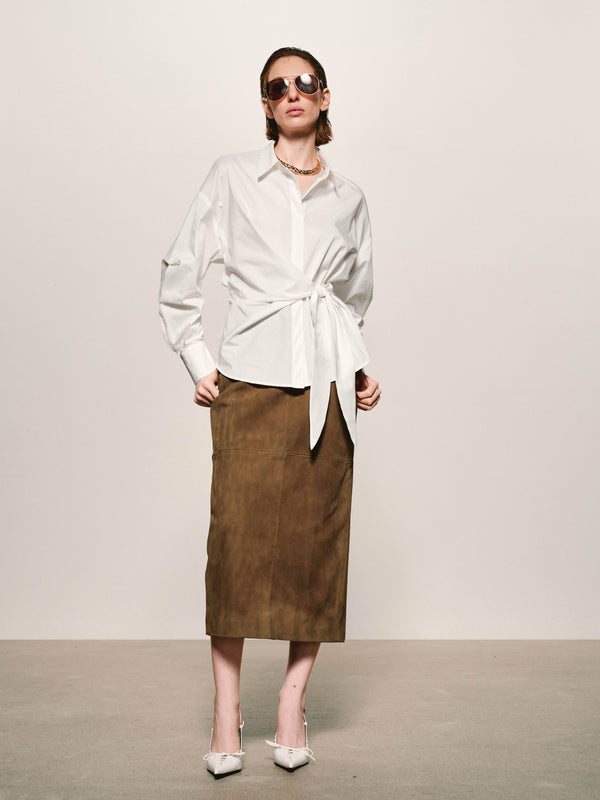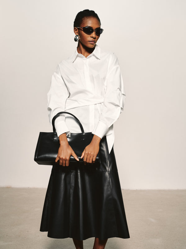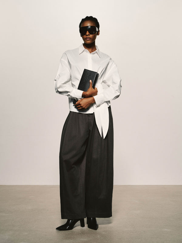 Una camisa de algodón escultórica definida por un nudo controlado, que desplaza sutilmente el volumen y la proporción dentro de una silueta clásica de camisa.