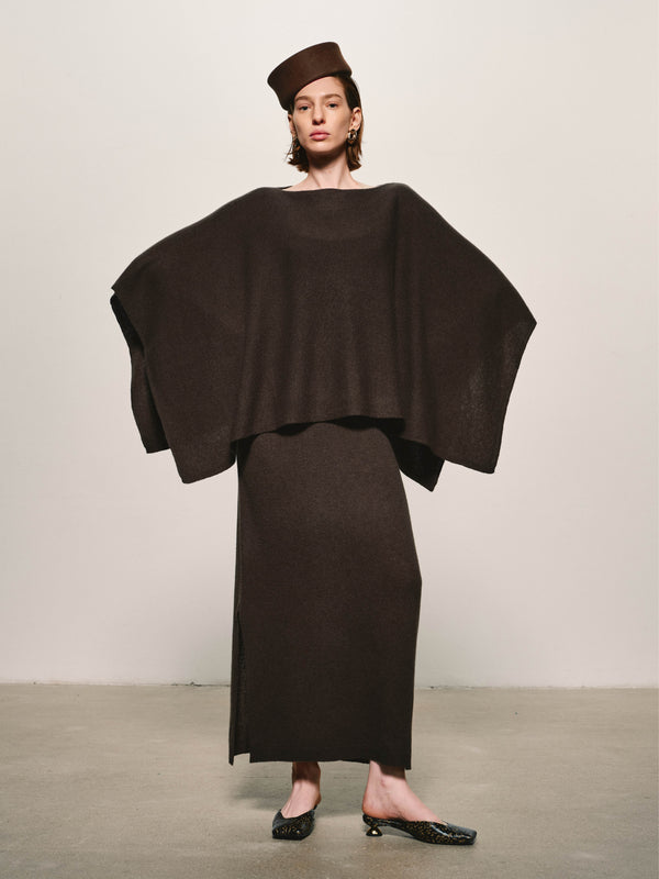 Un vestido largo y sobrio, tipo columna, en lana pura—líneas limpias, peso equilibrado y una presencia discreta.