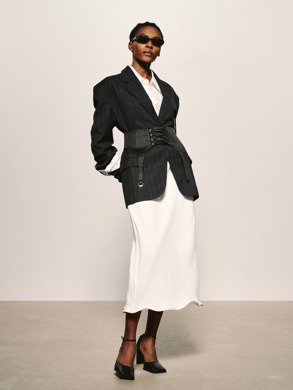 A pointelle-knit shell that reads like a whisper—sheer structure, quiet texture, and a clean edge. Fabric Shell: 64.8% Acrylic, 28% Wool, 7.2% Nylon Care Dry clean recommended.Do not machine wash.Line dry in shade; avoid direct sunlight. Model is 177 cm...