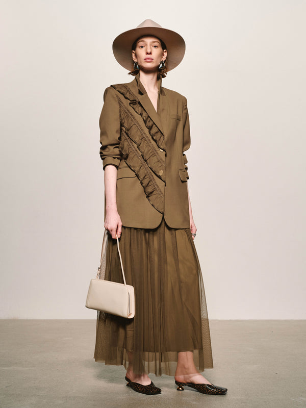 A sculptural blazer shaped by asymmetric splicing and a controlled ruffle detail, redefining balance within a classic tailored form.