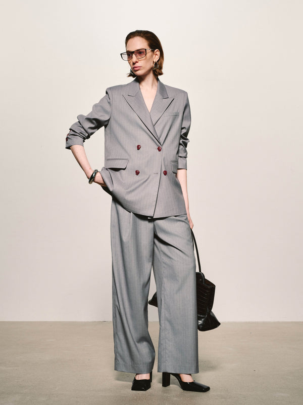 A tailored pinstripe blazer defined by precise proportions and a softened structure, balancing classic suiting with a quiet modern restraint.